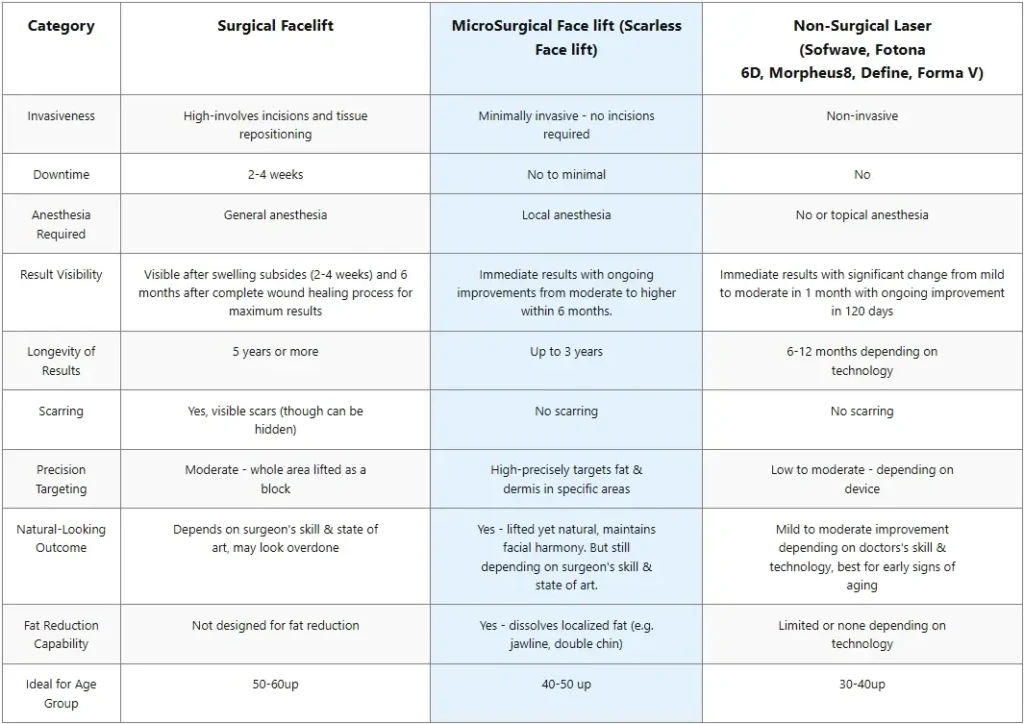 Category | Surgical Facelift | MicroSurgical Face lift (Scarless Face lift) | Non-Surgical Laser (Sofwave, Fotona 6D, Morpheus8, Define, Forma V) |