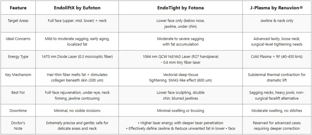 Endo Lift X by Eufoton – Endo Tight by Fotona – J-Plasma by Renuvion